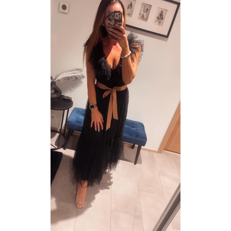 Ilus must tüllkleit beezi vööga. Kleit on midi pikkuses. Kleidil on v-kaelus ja kaasas vöö.