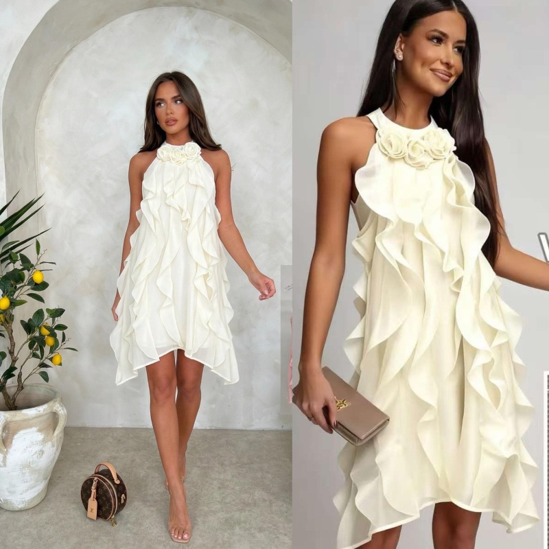 Lõige on vabalt langev ning ees ja külgedel on kihilised, lainelised volangid, mis annavad kleidile eriti piduliku ja õhulise mulje. Ülemises osas on kaunistuseks lilledetailid kaeluse juures ning alläär on asümmeetriline ja veidi lühem eest. Õrn kangas ja pehme drapeering teevad sellest efektse, romantilise peokleidi.