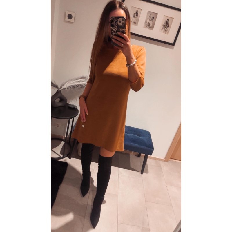 Heledam pruun pehmest materjalist a-lõikeline kleit. Kleidil on kolmveerand varrukad. Tagant kinnitub nööbiga.