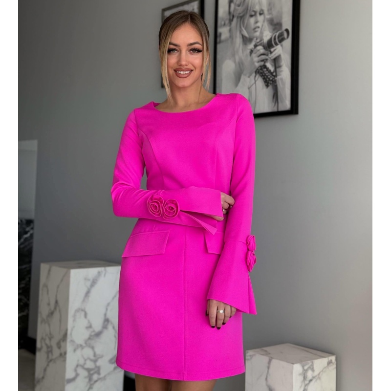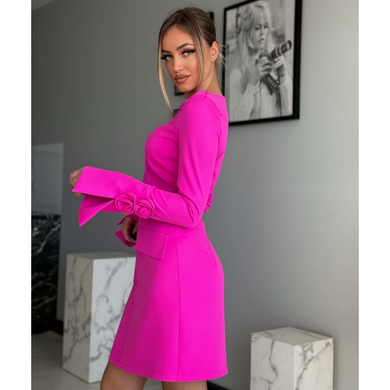 Fuksia kleit,millel on ümmargune kaelus,mida rõhutavad suured roosilaadsed lillemotiivid pikkade varrukate otstes.