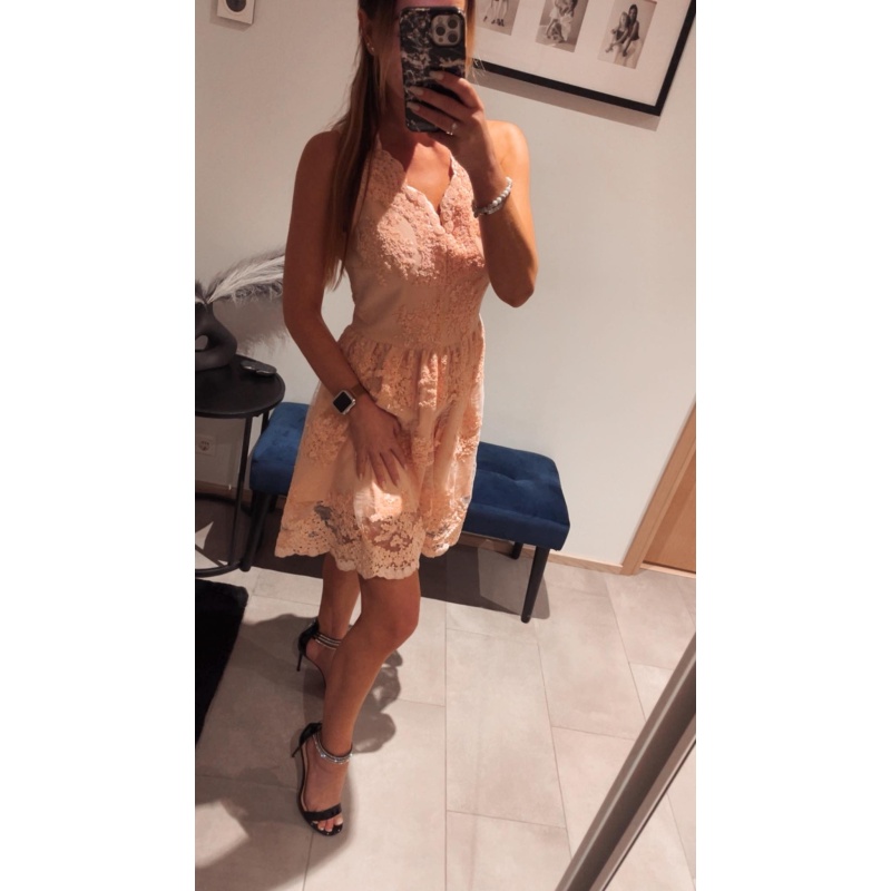 Imekaunis roosal põhjal, roosa pitsi ja tikanditega skater kleit. Kleidil on v-kaelus. Seljal lukk.