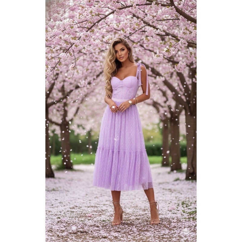 Kleit on õrnalt lilla ja romantilise ilmega. Sellel on korsett-stiilis ülaosa, õhukesed paelad õlgadel ning õhuline, mitmekihiline tüllist seelik, mis langeb midikõrguseni. Lisaks annab väikeste täpikestega kangas kleidile piduliku ja romantilise mulje.