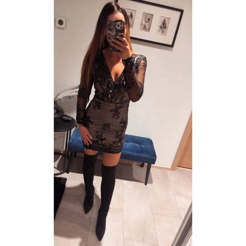 Litterkleit on lühike, keha ümber istuv ja elegantselt efektne musta pitsiga kaunistatud kleit.