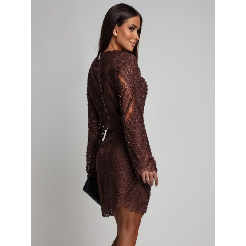 Komplekt koosneb šokolaadipruunist pidulikust miniseelikust ja pluusist, mis on kaunistatud pärlitega. Seelikul on all, laineline serv. Pluusil on pikad, laiad varrukad pärlitega, ümmargune kaelus ning see sobib ideaalselt seeliku peale. Pärlid on ainult ees.