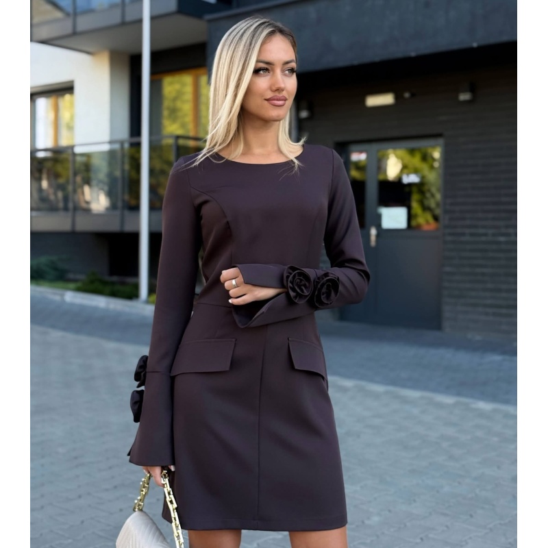 Tumepruun kleit,millel on ümmargune kaelus,mida rõhutavad suured roosilaadsed lillemotiivid pikkade varrukate otstes.