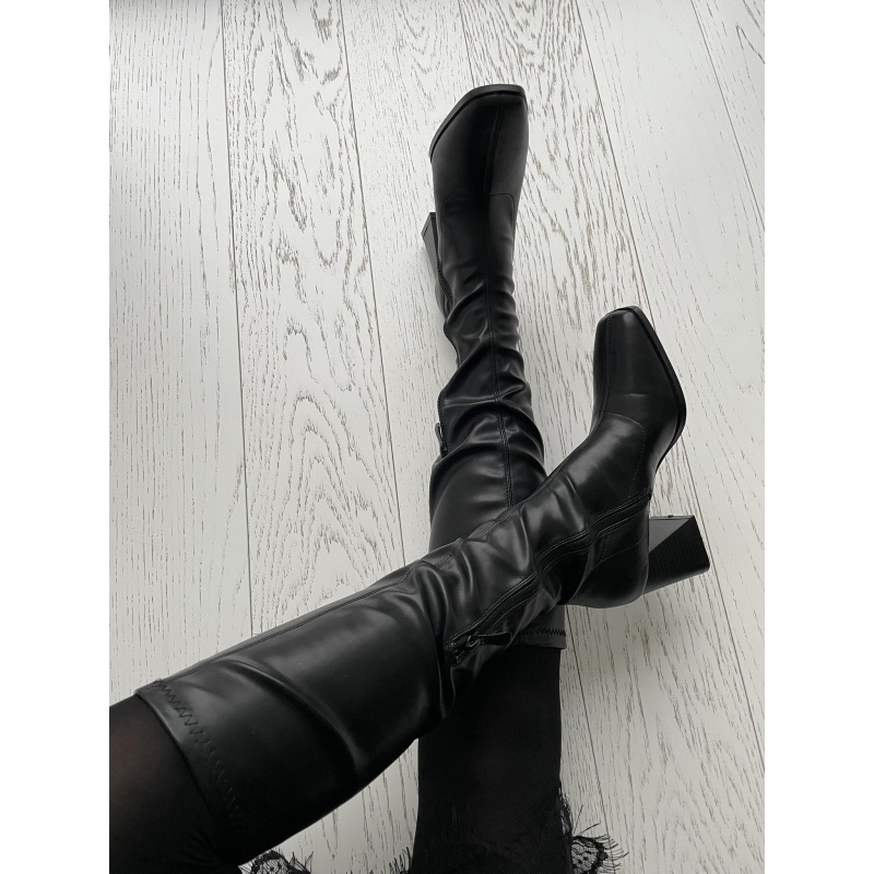 Stiilsed mustad põlveni ulatuvad saapad, mis on valmistatud siledast ja pehmest kunstnahast. Saabastel on plokk-konts, millel on karestatud muster, mis lisab mugavust ja stabiilsust. Neil on külje peal lukk, mis teeb jalgapanemise lihtsamaks. Ninaosa on kandiline, mis annab saabastele kaasaegse ja trendika välimuse.