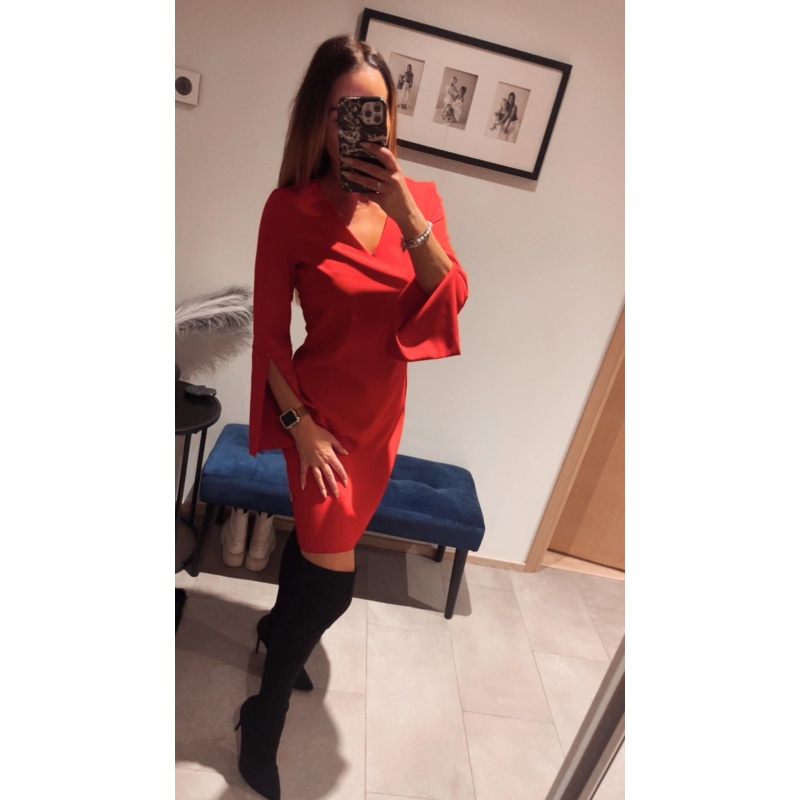 Punane klassikaline kergelt a-lõikeline kleit.Kleidil on alt laienevad varrukad.Tagant kinnitub lukuga.
